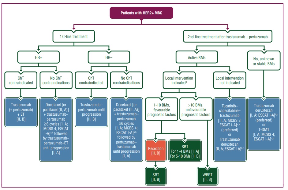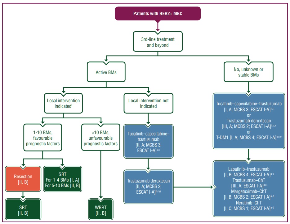 BM, brain metastasis; ChT, chemotherapy; CNS, central nervous system; EMA, European Medicines Agency; ESCAT, ESMO Scale for Clinical Actionability of Molecular Targets; ET, endocrine therapy; FDA, Food and Drug Administration; HER2, human epidermal growth factor receptor 2; HR, hormone receptor; MBC, metastatic breast cancer; MCBS, ESMO-Magnitude of Clinical Benefit Scale; PD, progressive disease; RT, radiotherapy; SRT, stereotactic radiotherapy; T-DM1, ado-trastuzumab emtansine; WBRT, whole brain radiotherapy.
